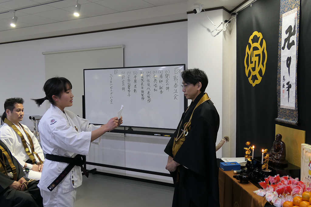 新春法会では昨年一般に編入した新中1の拳士が門信徒代表挨拶を務める伝統が、いつ頃からか続いていて、今年も新中1の拳士が務めてくれました。